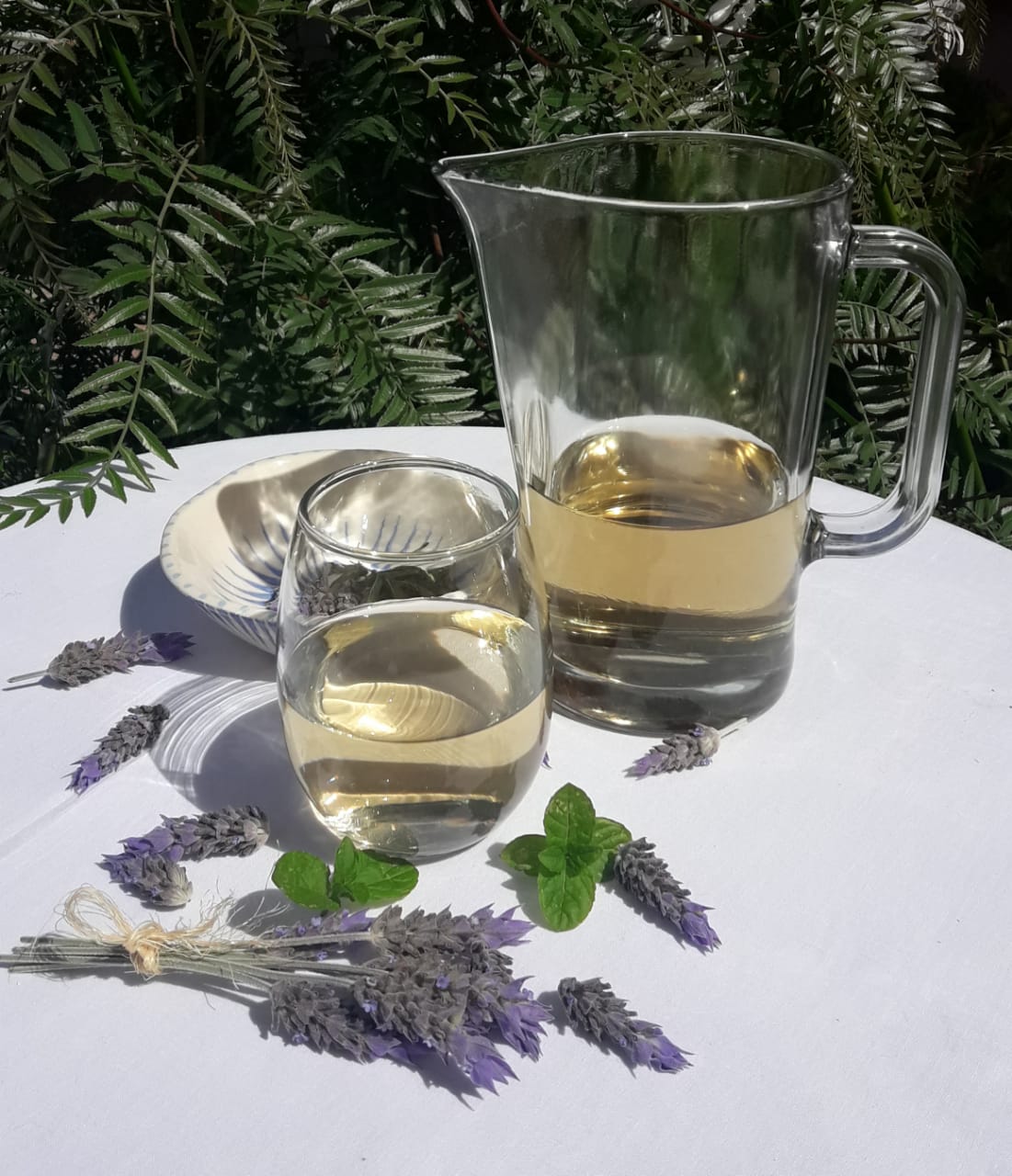Colocar las flores y las hojas en una tetera o un jarrito, llevar el agua a aproximadamente unos 80º (como para mate) y verter sobre las hojas y flores, tapar dejar reposar 10 minutos, colar, colocar en una botella de vidrio y llevar a la heladera por unas horas. Si queres endulzarla un poco a la preparación podes agregarle unas 3 hojitas de stevia fresca.