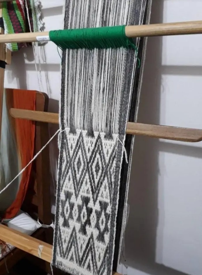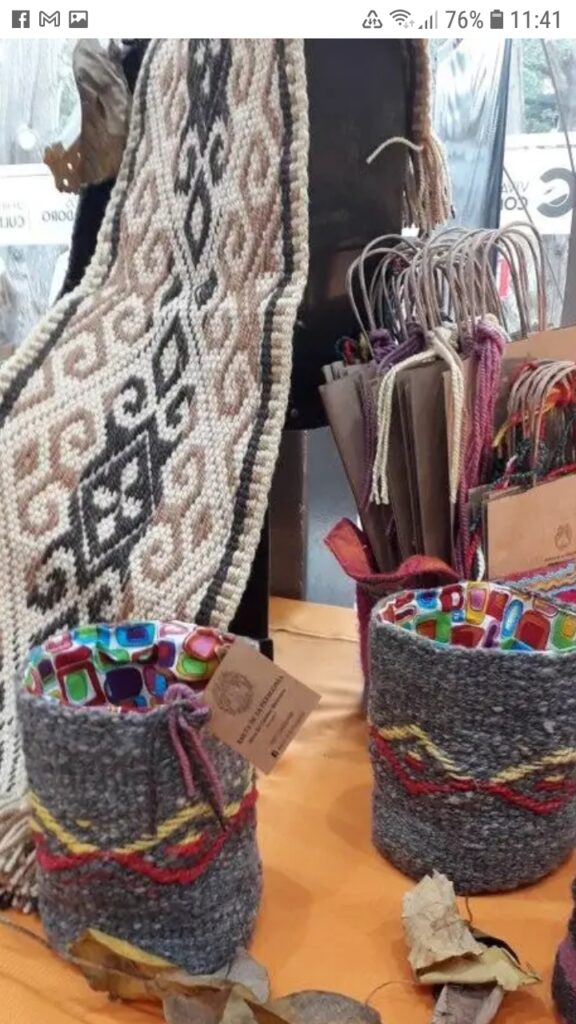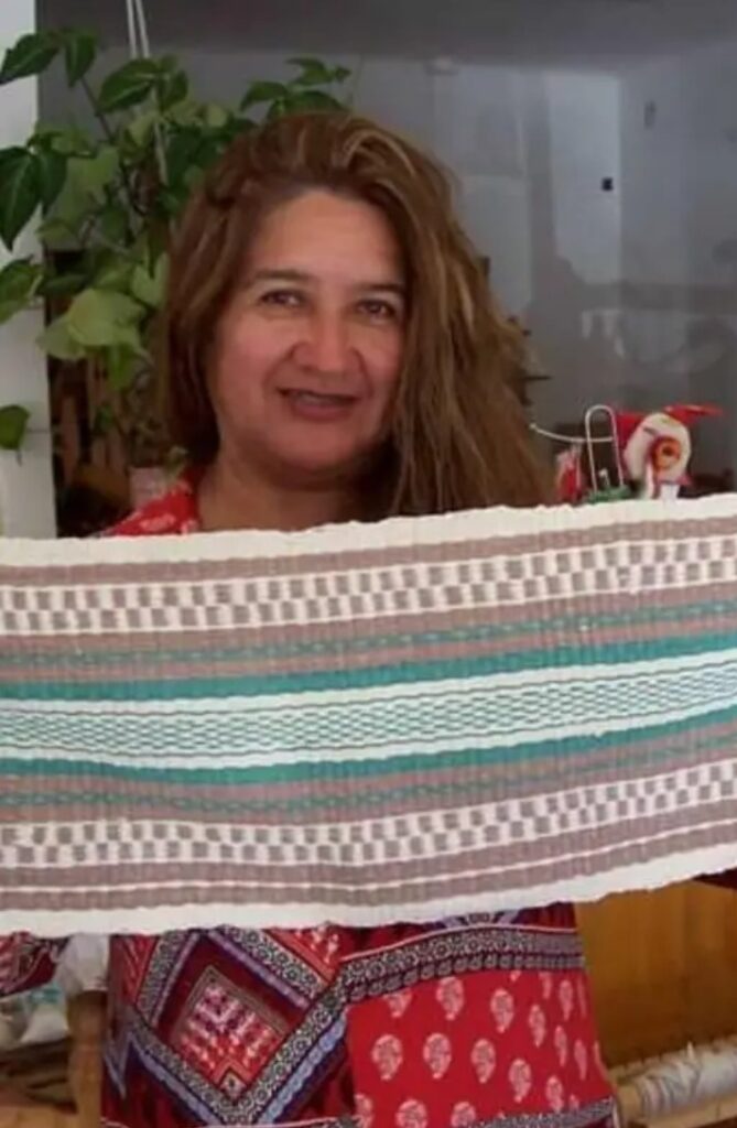 Explica que, junto a Rebeca Vega del colectivo de tejedoras, dio sus primeros pasos en el arte/oficio específicamente en telar mapuche hasta que en 2019 cursó la capacitación “Tejedora Telar Artesanal” en el Centro de Formación Profesional 652 que funciona en la Rural comodorense con la profesora Vanina Díaz quien le trasladó técnicas del telar mapuche o Huitral.Y explica sobre esta herramienta clave: “Es vertical, se puede trabajar sentado o de pie. Es fácil y en su versión más rústica se necesitan dos parantes y dos travesaños de madera. Se arma atando cuerdas y se le adhieren dos palos para ir dando forma a la urdimbre, entrecruzamiento y trama; se tejen ponchos, mantas, fajas, alforjas”