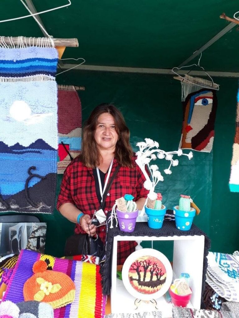 “Nací en 1965 en Comodoro Rivadavia que desde entonces ha sido mi hogar. Desde pequeña estuve en contacto con el tejido a dos agujas, ya que mi madre nos realizaba los abrigos. Así que, como espectadora, fue mi primera maestra.Luego, en la primaria con una monjita llamada Victoria aprendí la técnica de crochet en la materia Labores que tenía por objetivo desarrollar potencialidades motoras, psicomotricidad fina, y que se incorpore como una herramienta para la vida. Me fui dando cuenta que los hilos tejían mi historia. Luego incursioné en el tapiz realizado en un bastidor de clavos y también en el telar María o de mesa”, cuenta con orgullo sobre sus orígenes.
